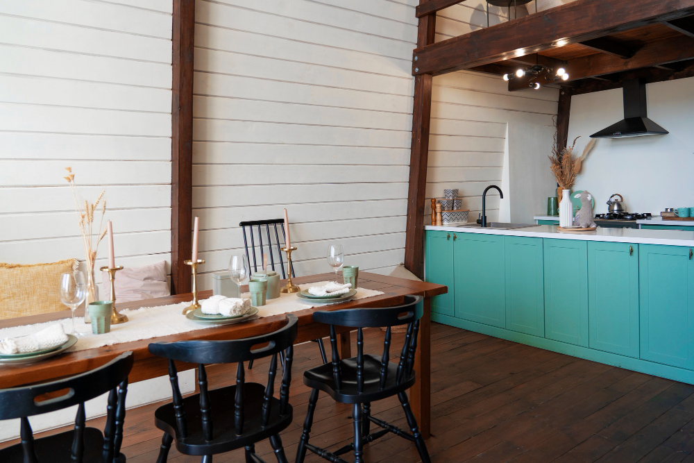 Pardoseala contribuie la definirea atmosferei. Parchetul din lemn natural sau plăcile ceramice cu aspect de piatră sunt alegeri potrivite. Într-o bucătărie mai spațioasă, podeaua poate avea un model discret, inspirat din stilul clasic, dar reinterpretat într-o cromatică actuală.